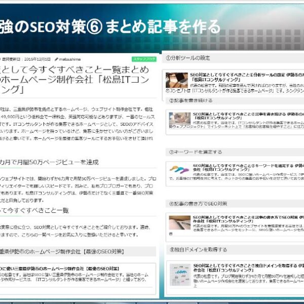 三重県伊勢市を中心に展開してるホームページ制作会社の松島ITコンサルティングです。客観的に三重県で一番のSEO対策会社として、150を超えるお客様にご利用頂いております。証左として、「三重県 seo」とグーグルやヤフーで検索してみてください。松島ITコンサルティングのホームページが一番上に表示されます。