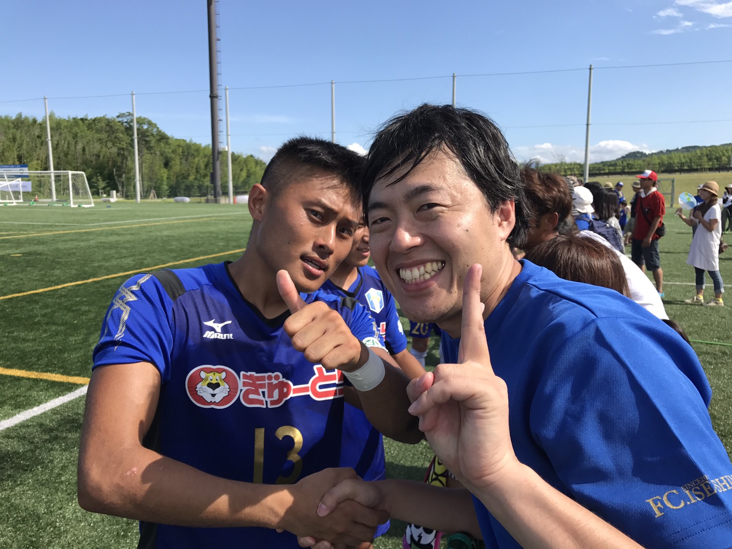 地元密着の球団だけあって、試合後は選手と握手できるし、会話もできます。お願いすれば写真も取ってくれます。今回も石場大豊選手と写真を撮りました。次は大野泰祐選手にもお願いしてみます。試合前に申し込めば、選手によるサッカー教室も、試合後に受けれます。試合で疲れた体で、サッカー教えてくれるっていいですね。