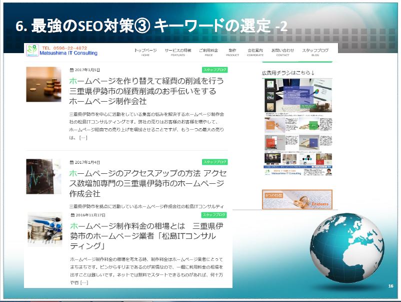製作費用49,900円、月額保守費用4,900円で集客に特化したホームページを作成する三重県伊勢市のホームページ制作会社の松島ITコンサルティングです。大学卒業以来、システムエンジニア一本で培ってきたIT知識を武器にホームページを作成します。豊富なプログラミング経験で、お客様のご要望の機能を付加したホームページを制作します。伊勢市の高柳商店街でセミナー講師を務めさせて頂きましたSEO対策について、説明しています。
