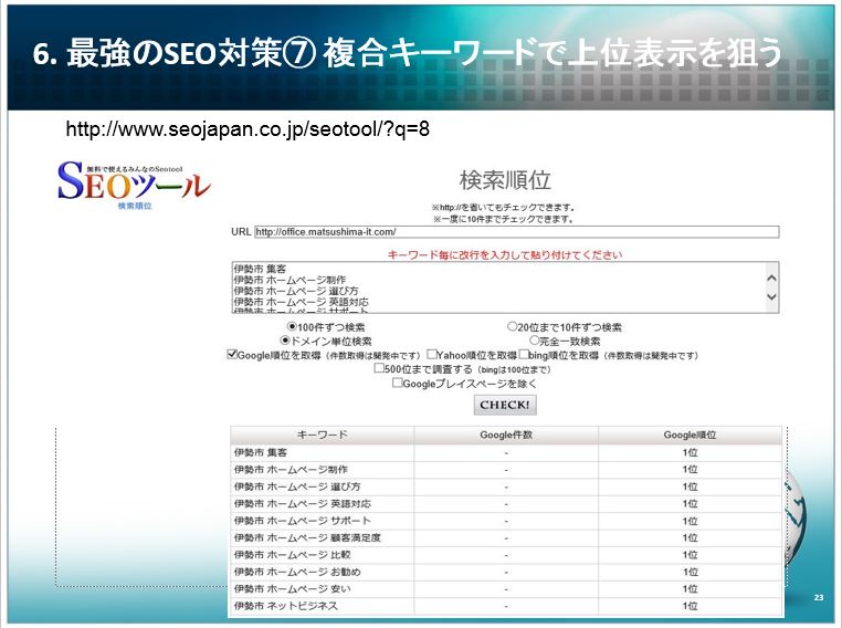 ホームページ制作当初は、ビッグキーワードではライバルに負ける為、複合キーワードで上位表示を狙う戦略が必要です。「伊勢市でホームページを作ろう」と思う人でも、より理想のホームページ制作会社を探すために、他にもキーワードを入力して、検索エンジンで検索します。値段が安いホームページ制作会社を探している人は「伊勢市 ホームページ制作 安い」と探しますし、デザインが良いホームページ作成会社を探している人は「伊勢市 ホームページ制作 デザイン」と探します。このような複数のキーワードのことを「複合キーワード」と呼びます。この複合キーワードを狙って、SEO対策をします。ビッグキーワードでは勝てない為に、複合キーワードで勝って、アクセス数をこつこつ増やすのです。アクセス数を増やすことにより、ホームページの力が強くなり、ゆくゆくはビッグキーワードでもライバルに勝てるようになります。当社も今でこそ「伊勢市 ホームページ制作」のキーワードでグーグル、ヤフー共に1位表示を獲得していますが、初めの頃は複合キーワードでアクセス数を稼ぎ、ホームページを強くしてきました。以下に、複合キーワードの例を貼っておきますので、参考にしてみて下さい。当社は、画像にある全ての複合キーワードで1位に表示されています。