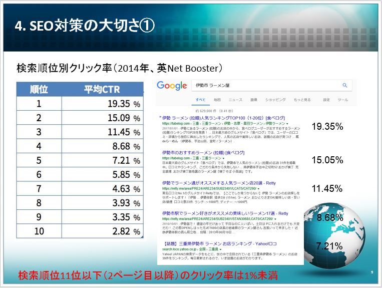 2014年にイギリスのNet Booster社が発表した検索順位別クリック率は次のようになります。1位は19.35%、2位は15.09%、3位は11.45%、4位は8.68%、5位は7.21%、6位は5.85%、7位は4.63%、8位は3.93%、9位は3.35&、10位は2.82%です。2ページ目となる11位のクリック率は1%未満です。検索結果の1位に表示されたホームページは、約20%の人がクリックして見てもらえますが、2ページ目以降に表示されたホームページは、クリック率は1%以下です。絶望的に見てもらえません。つまり集客という観点では、検索結果の上位に表示されることはとても大切です。ホームページは見た目の格好良さや使いやすさなどもとても大切ですが、SEO対策をしなければ、その格好良さを見てもらうこともできないし、使ってもらうこともできません。まずはSEO対策によって、ホームページを人に見てもらうことに注力すべきです。