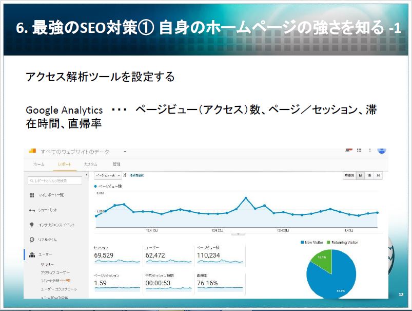 「Google Analytics」では、最低限として、ページビュー(アクセス)数、ページ/セッション、滞在時間、直帰率は見るようにしてください。滞在時間が30秒以内、直帰率が9割を超えていると要注意です。ホームページが訪問者にとって有益なものになっていません。最悪の場合、検索結果の圏外に飛ばされて、2度と日の目を見ることが無くなります。