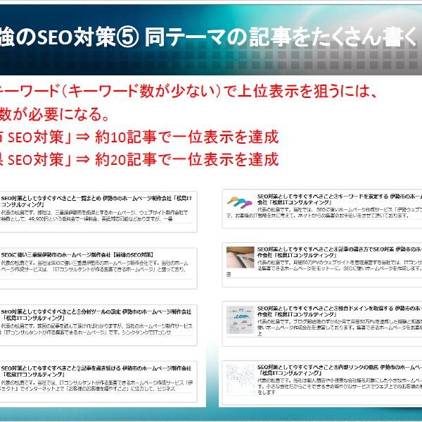 SEO対策に絶対の強みを持つ三重県伊勢市のホームページ制作会社「松島ITコンサルティング」代表の松島です。弊社は、グーグルやヤフーなどの検索結果の上位表示に拘り、新規顧客獲得の為のホームページを作成します。